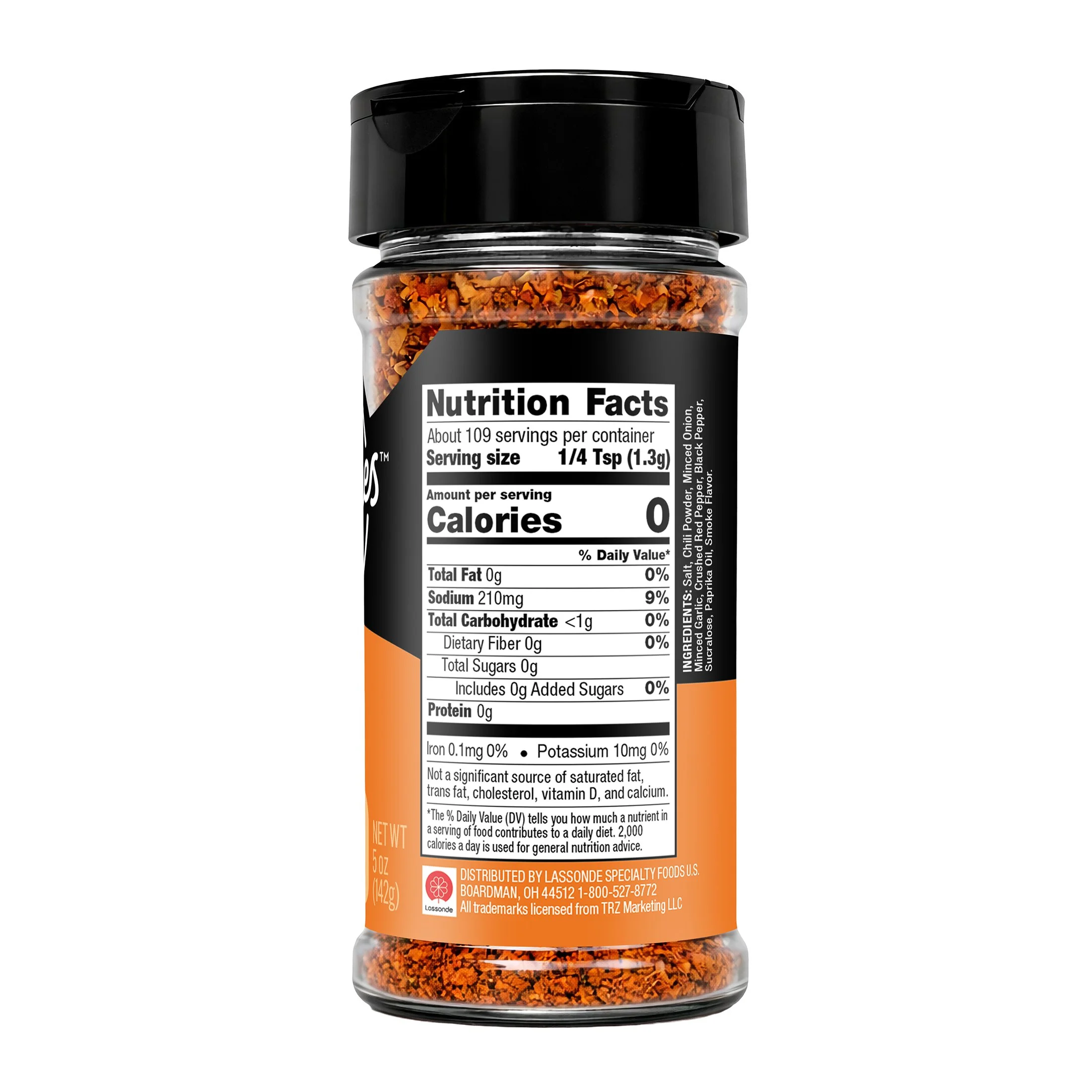 INGREDIENTS: Salt, Chili Powder, Minced Onion, Minced Garlic, Crushed Red Pepper, Black Pepper, Sucralose, Paprika Oil, Smoke Flavor.