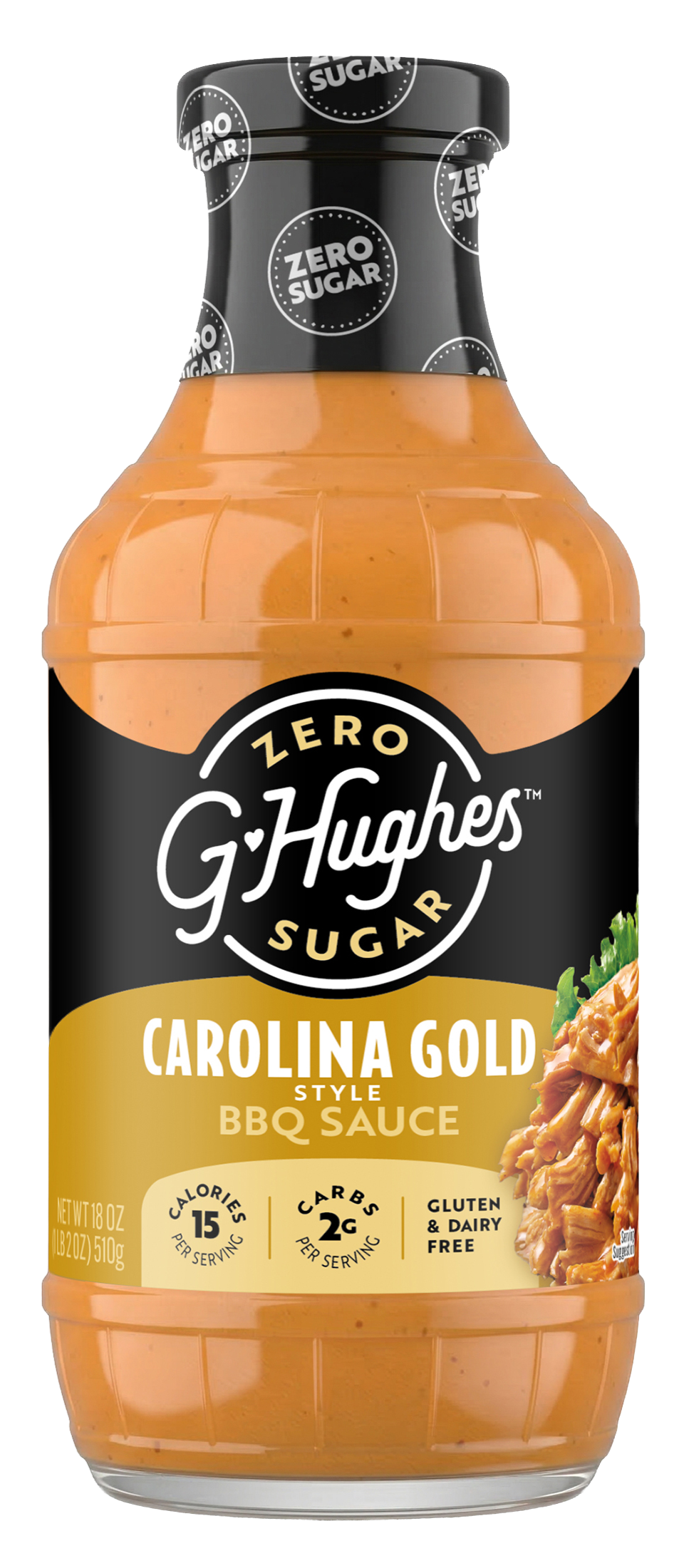 G Hughes Zero Sugar Carolina Gold BBQ Sauce features a savory, tangy, mustard flavor with a touch of sweetness and a hint of hickory smoke—big, bold Carolina taste with zero sugar.