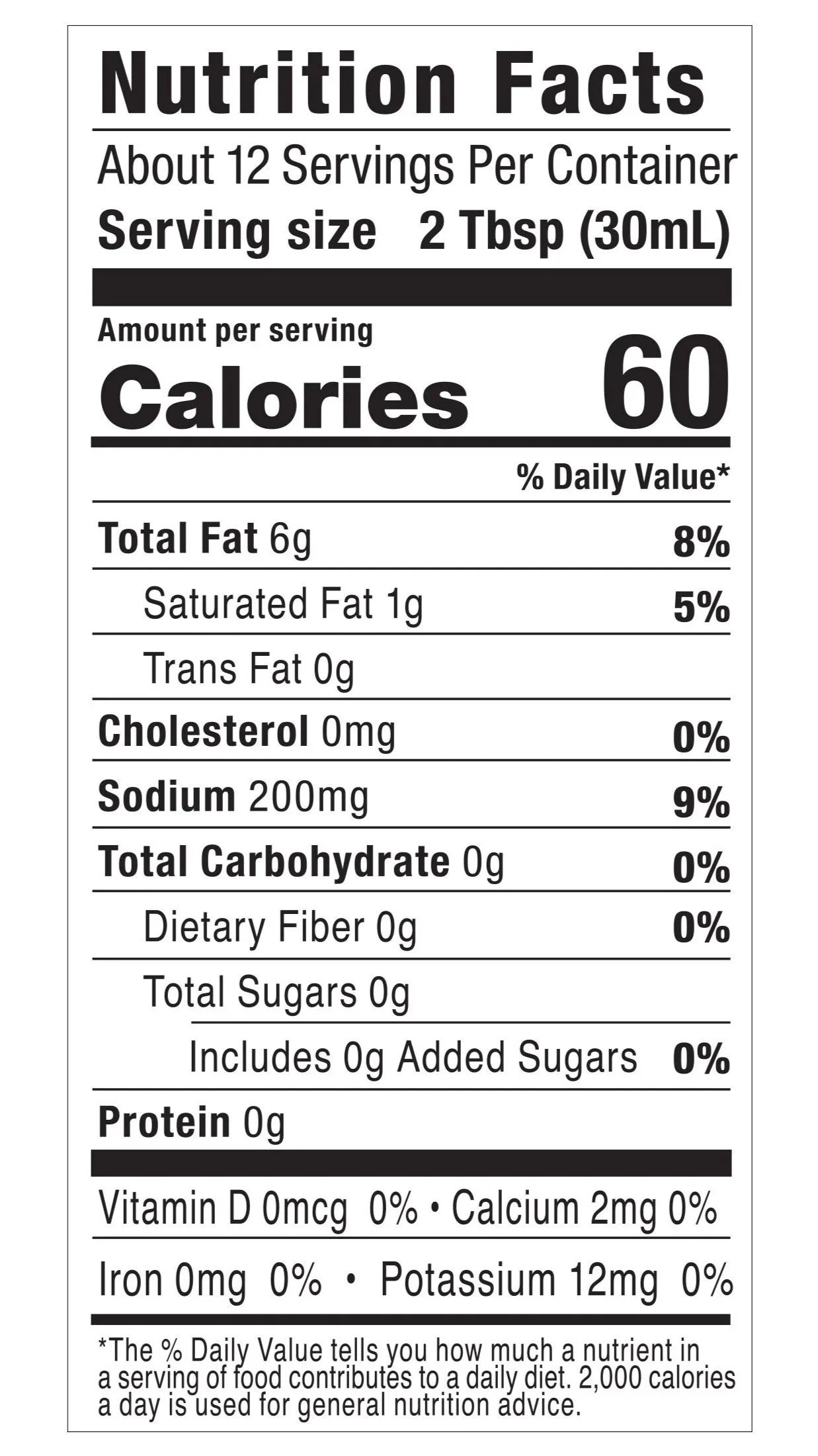 INGREDIENTS: Water, Vegetable Oil Blend (Olive And Soybean And/Or Canola), Distilled Vinegar, Apple Cider Vinegar, Salt, Spices, Dried Garlic, Xanthan Gum, Potassium Sorbate And Sodium Benzoate (Preservatives), Dried Onion, Sucralose, Calcium Disodium EDTA (To Preserve Flavor).