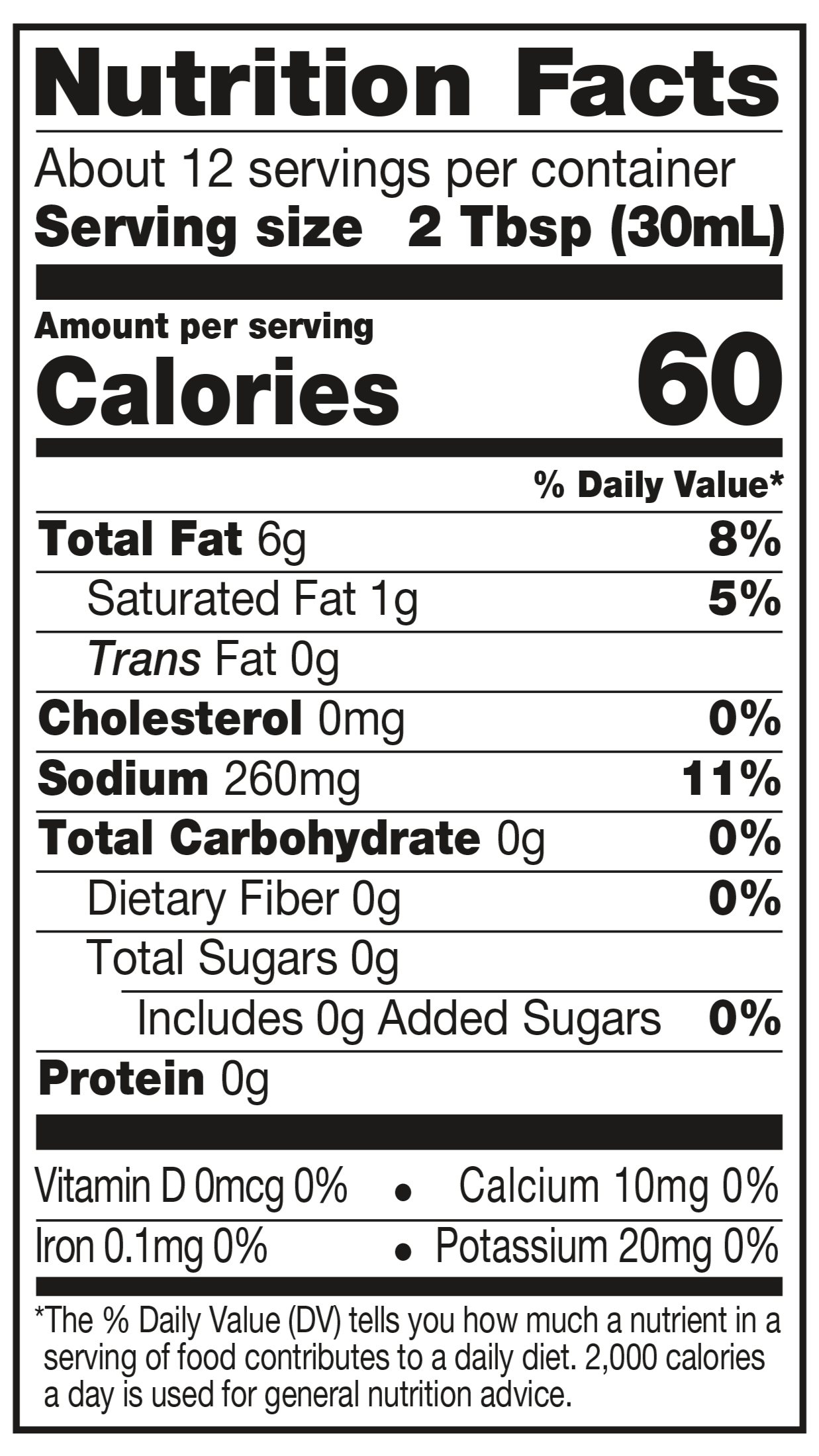 INGREDIENTS: Water, Vegetable Oil Blend (Olive And Soybean And/Or Canola), Mustard (Vinegar, Water, Mustard Seed, Salt, Turmeric), Distilled Vinegar, Apple Cider Vinegar, Salt, Egg Yolks, Celery Seed, Xanthan Gum, Dried Onion, Potassium Sorbate And Sodium Benzoate (Preservatives), Spice, Sucralose, Calcium Disodium Edta (To Preserve Flavor). Contains: Egg.