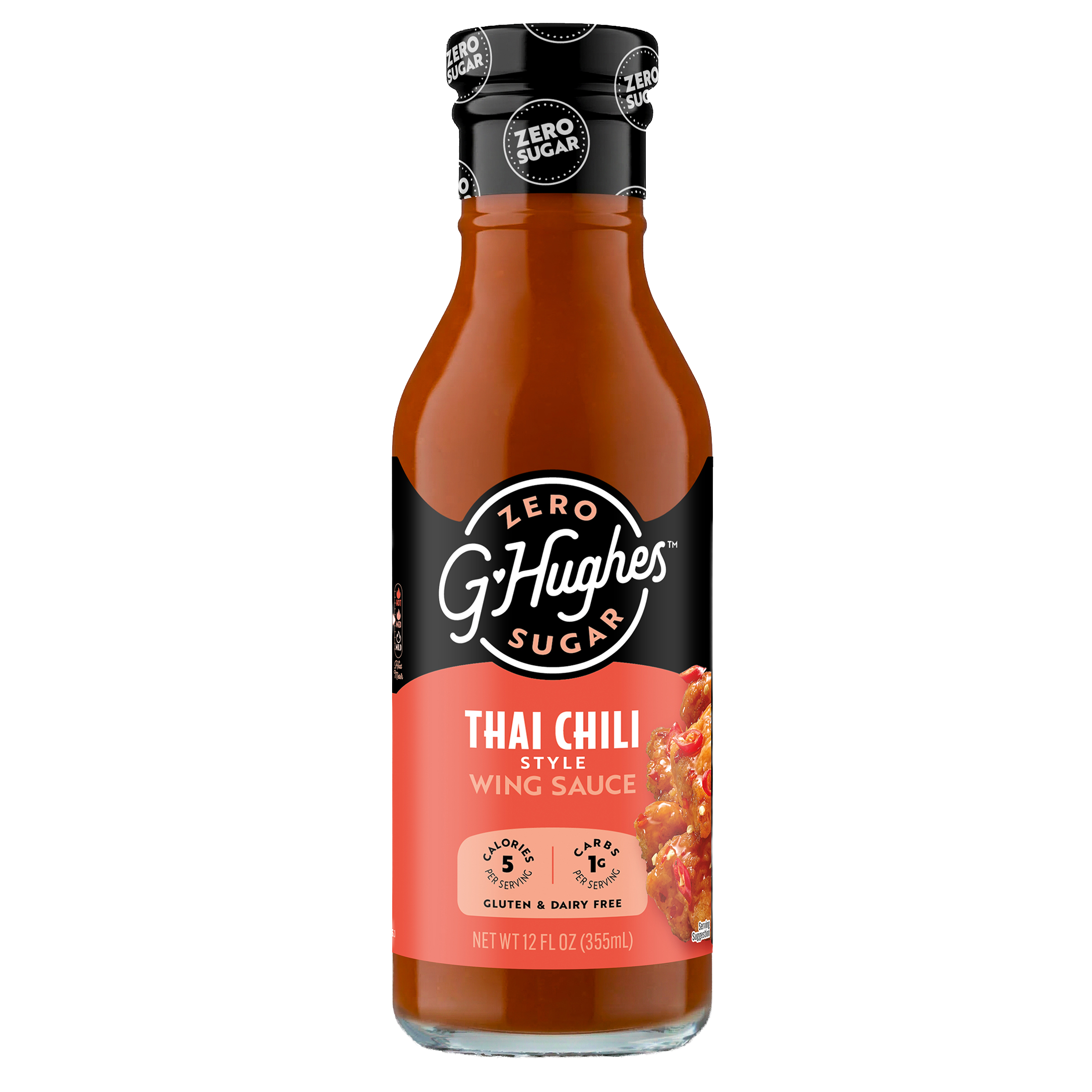 G Hughes Zero Sugar Thai Chili Wing Sauce is a sweet‑heat blend inspired by classic Thai chili flavors.